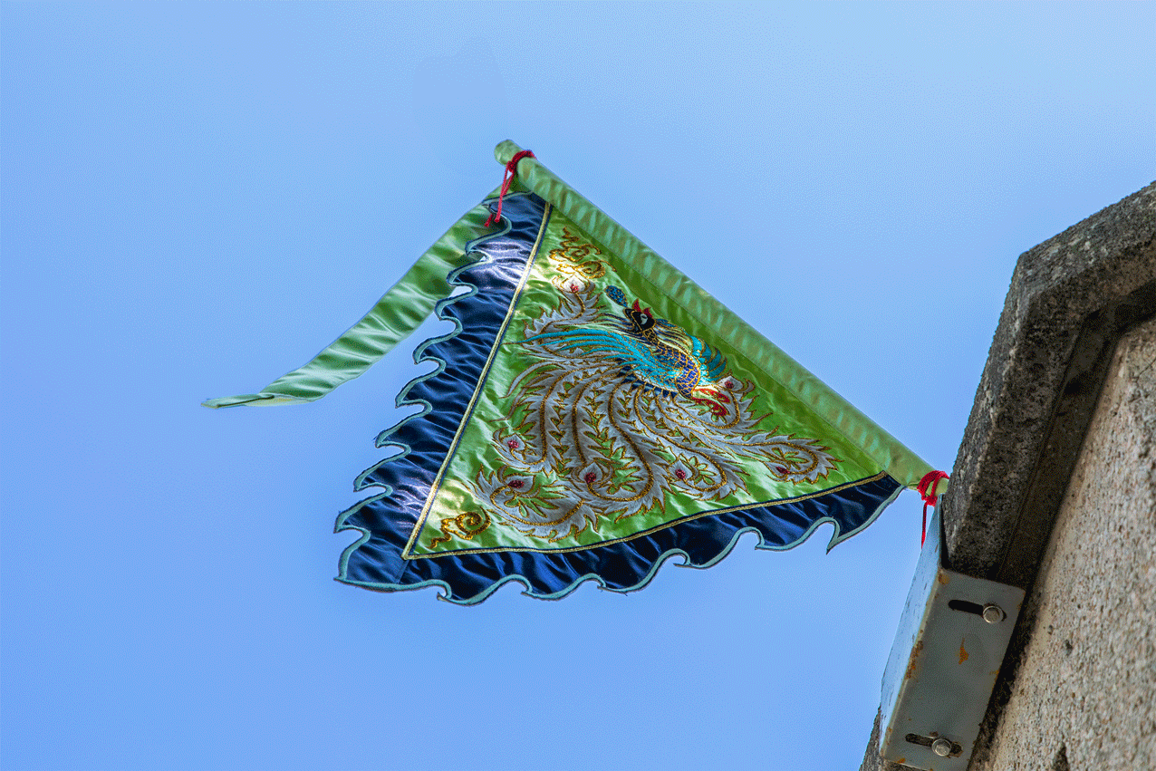 Across rituals of Taiwanese religions, flags of order are embroidered and widely used in representation of different spiritual bodies, gods and goddesses. As a symbol of goddesses and female power, a phoenix with many tails evolves from ancient times, back to when the phoenix was a combination of legendary birds (one feminine and one masculine). The embroidered phoenix on Mong-Hsuan Tsai’s flag has the colours of the Formosan blue magpie. It's the sacred bird of the Taiwanese aborigines, and also one of those the artist admires daily from her window. "All phoenixes fly together," is its message as it leads the way, encouraging minorities to join and aim for the sky, and ensures no one gets left behind.